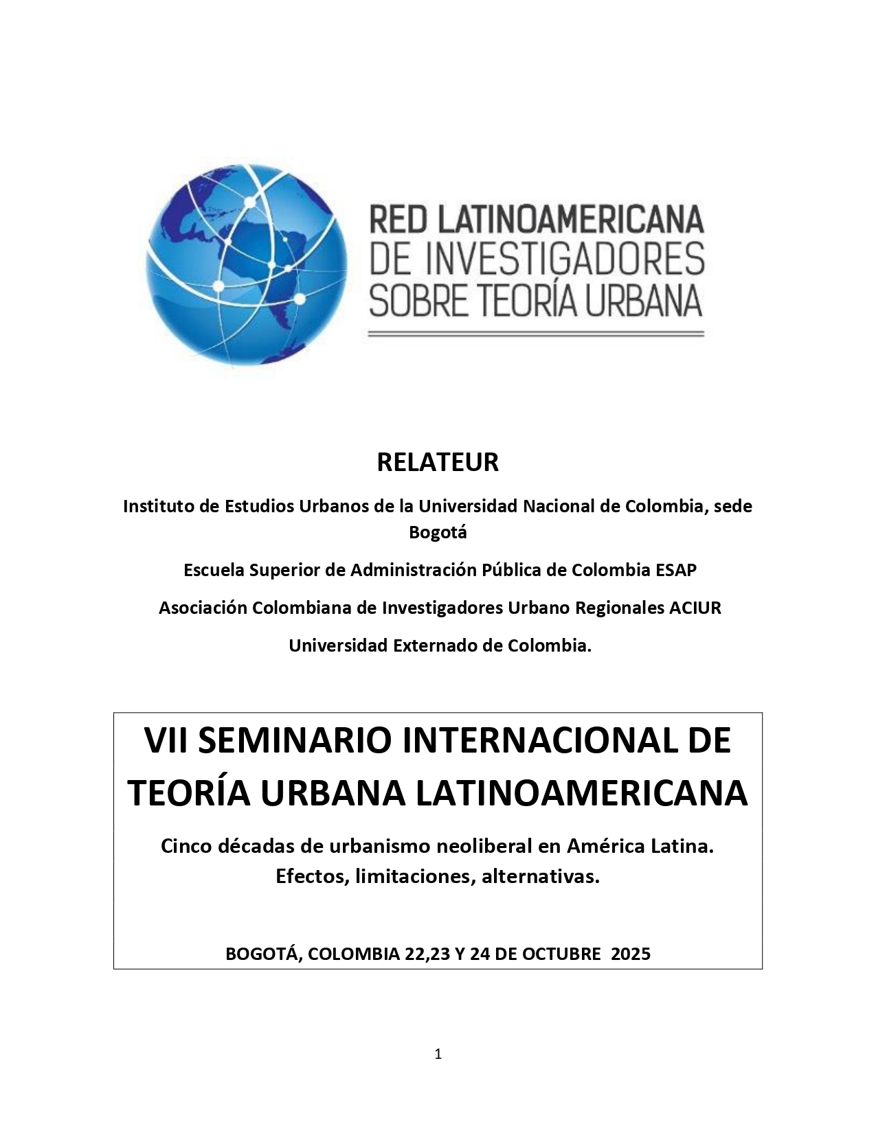 Convocatoria al VII Seminario Internacional de Teoría Urbana RELATEUR abre la convocatoria a su VII Seminario Internacional de Teoría Urbana Latinoamericana que se llevará a cabo en Bogotá, en forma híbrida (presencial y virtual), del 22 al 24 de octubre de 2025. Sus convocantes institucionales son la propia RELATEUR; el Instituto de Estudios Urbanos de la Universidad Nacional de Colombia, sede Bogotá; la Escuela Superior de Administración Pública de Colombia ESAP; la Asociación Colombiana de Investigadores Urbano Regionales ACIUR y la Universidad Externado de Colombia.
